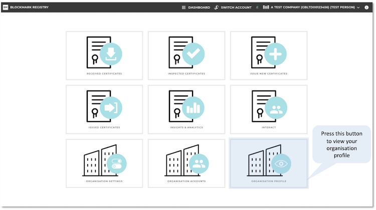 The next section lists the public certificates issued to the organisation. These are shown as summary cards with buttons to click through to the digital certificate page. The cards have coloured bands to highlight official digital certificates that have been issued from the platform (green), self-uploaded certificates of pdf evidence issued from elsewhere (blue) and test certificates (grey).