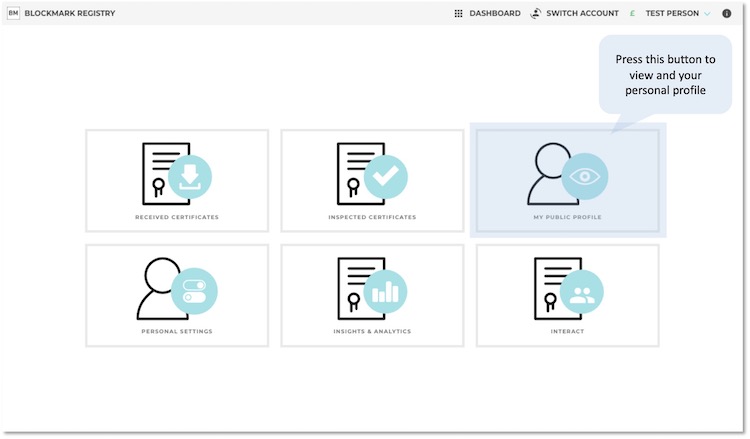 Your personal profile is created as part of the registration process. You can reach it from your personal dashboard. If a certificate is issued to a person who has not yet created an account, an associated profile is not created.