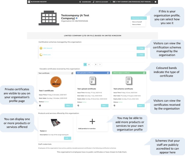 If you view the profile 'as yourself', you will see additional information based on your affiliation with the organisation and any associated permissions. For example, you'll see private certificates and, with appropriate permissions, the 'add product or service' button. You can also view 'as visitor' which will show you how others will see your profile.