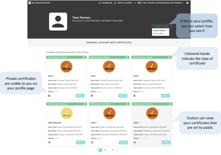 The main section lists the certificates issued to the person. These are shown as summary cards with buttons to click through to the digital certificate page. The cards have coloured bands to highlight official digital certificates that have been issued from the platform (green), self-uploaded certificates of pdf evidence issued from elsewhere (blue) and test certificates (grey).